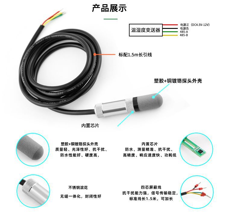 RS485一體溫濕度變送器采用進口RHT系列溫濕度傳感器,探頭部分采用塑膠材質(zhì)防水性能好,質(zhì)量輕,外殼采用銅鍍鉻材料,硬度高,光澤性好,物美價廉。